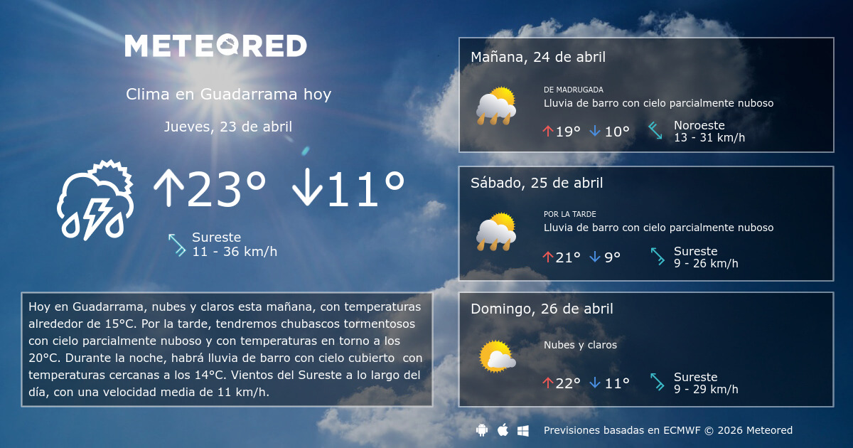 Web El Tiempo en Guadarrama. Web Aujourdhui à Guadarrama létat du ciel restera changeant. Web Previsión de tiempo lluvioso desde el sábado a última hora de la noche hasta el domingo por la tarde Noche 1112 42 Baja RealFeel 41 Nubosidad baja Mañana 1212 52 48 RealFeel 50 Nublado. Il mese più caldo.